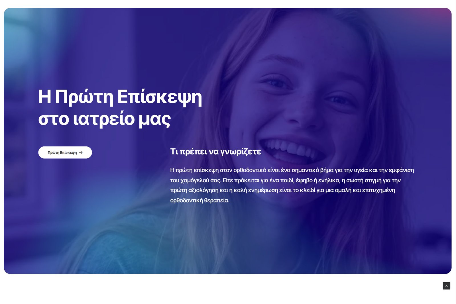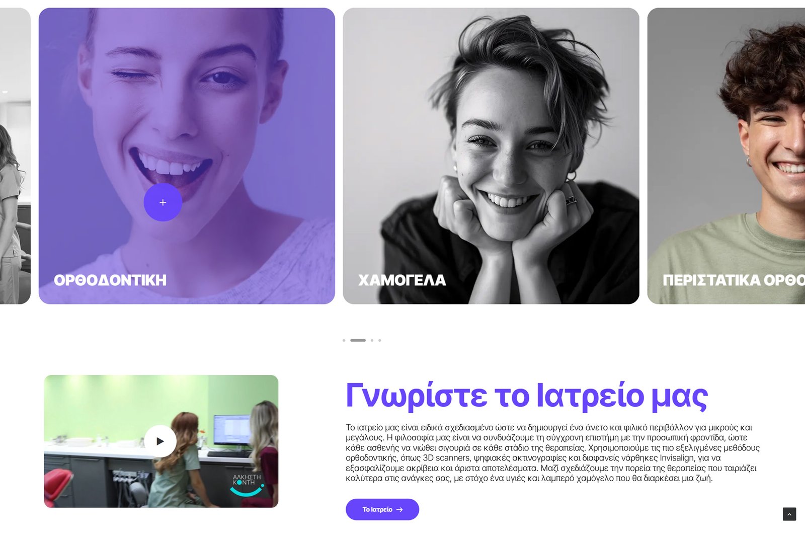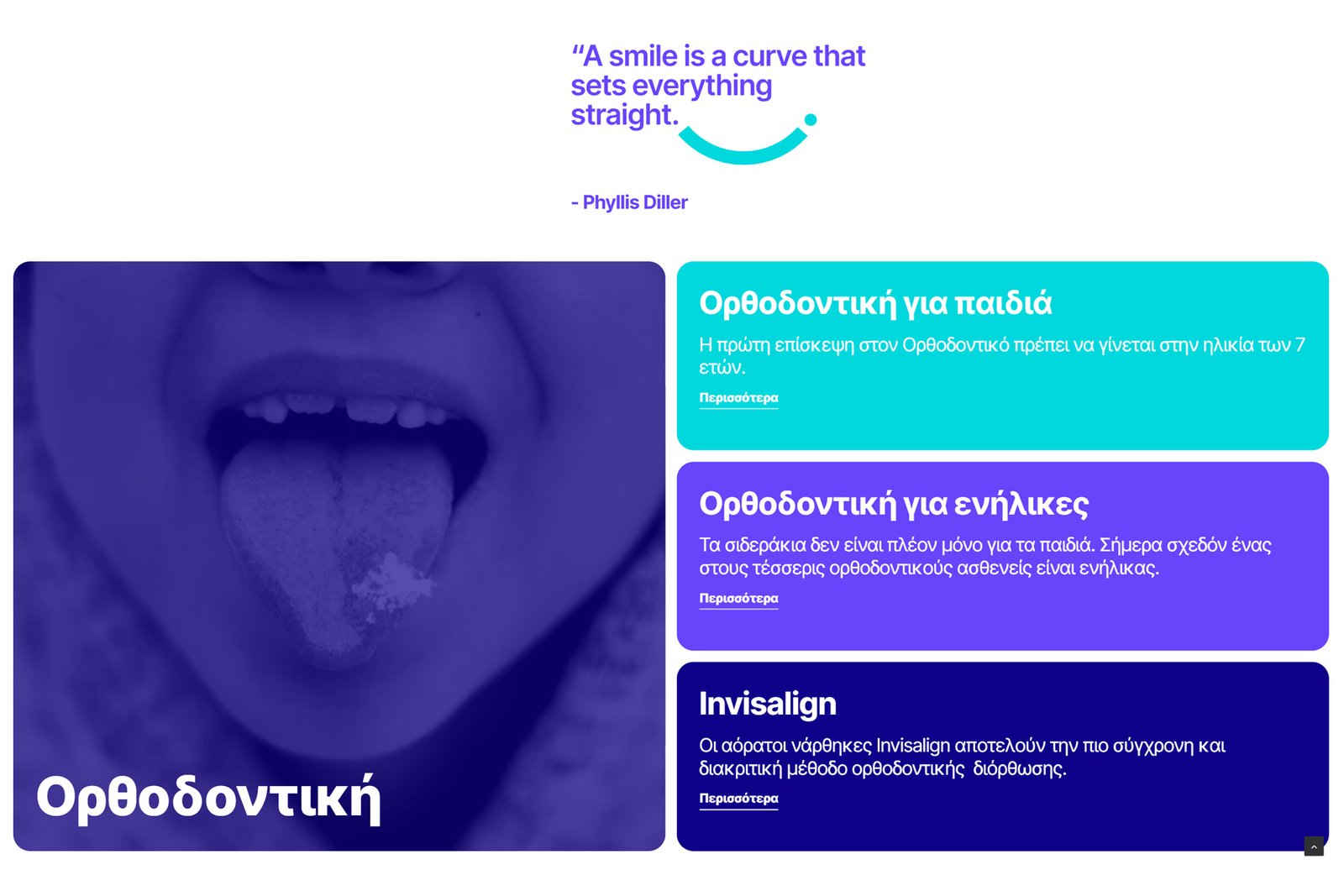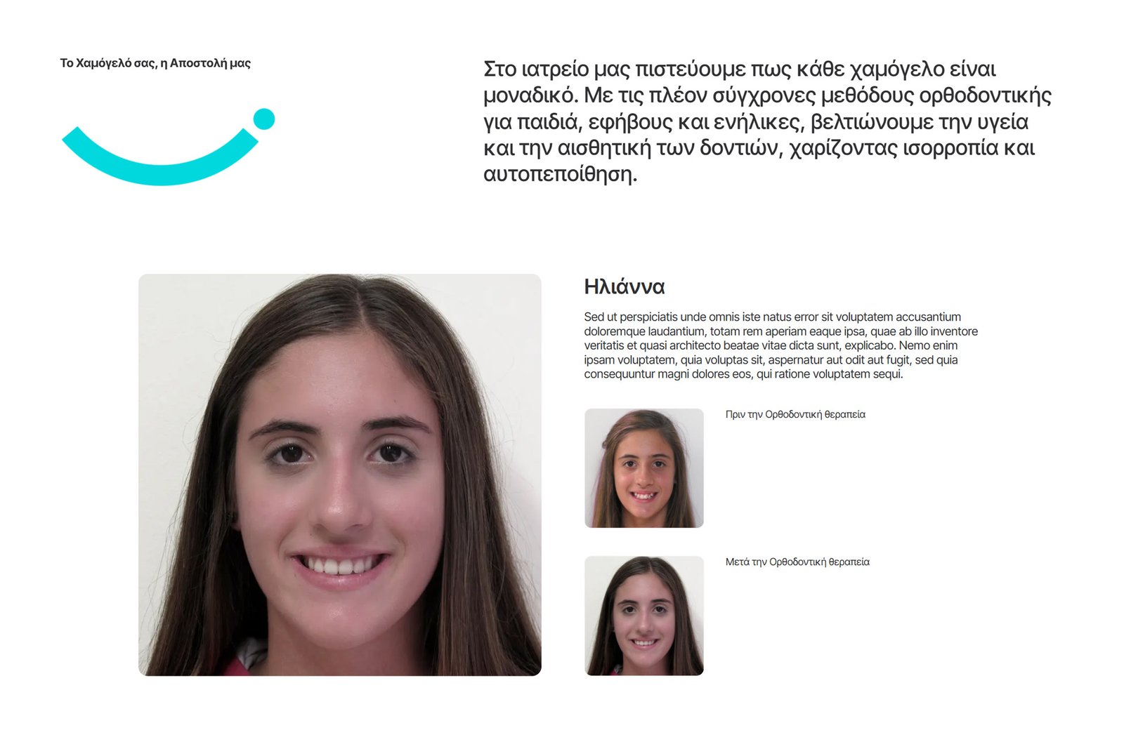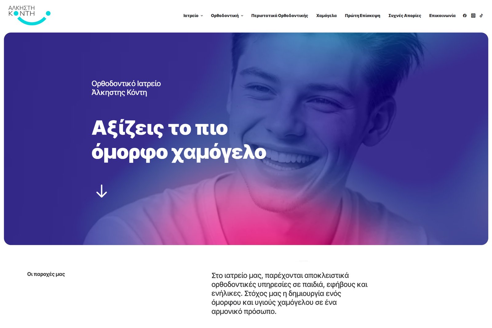 Ο ιστότοπος επανασχεδιάστηκε με στόχο να αποτυπώσει μια πιο σύγχρονη, φρέσκια και προσιτή εικόνα στον χώρο της ορθοδοντικής. Η αισθητική του βασίζεται σε καθαρές γραμμές, φωτεινή χρωματική παλέτα και ισορροπημένη τυπογραφία, δημιουργώντας ένα περιβάλλον που αποπνέει εμπιστοσύνη, χωρίς να αφαιρεί από τη ζεστασιά και την ανθρώπινη διάσταση. Δώσαμε έμφαση σε μια νεανική, αισιόδοξη προσέγγιση, που αντικατοπτρίζεται στο visual direction και στη συνολική εμπειρία πλοήγησης. Το αποτέλεσμα απομακρύνεται από τη συνηθισμένη «κλινική» αισθητική, προτείνοντας ένα πιο φιλικό και σύγχρονο digital περιβάλλον που απευθύνεται σε παιδιά, εφήβους και ενήλικες.